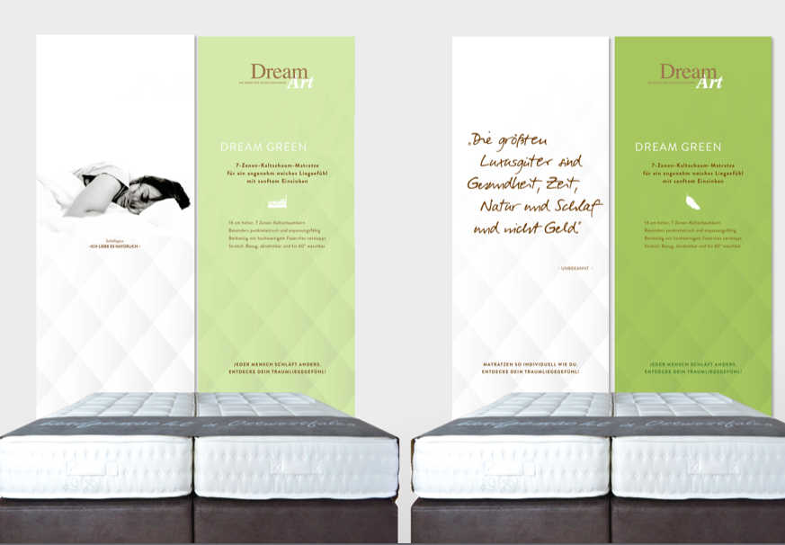 IDEE: Hierzu wurde auf technische Darstellungen auf den Displays verzichtet und stattdessen das individuelle Liegegefühl herausgearbeitet. Zur emotionaleren Vermarktung wurde u.a. jedes Produkt der 3 unter-schiedlichen Serien (Classic, Nature und Move) mit einem Namensfeeling versehen, wie bspw. “dream softly“, "dream sweetly“, "dream deep“, "dream smart“ etc. statt wie vorher mit einer unpersönlichen kalt und technisch wirkenden Nummernbezeichung. Der neu kreierte Slogan „Die Kunst des guten Schlafens“ positioniert mit individuell unkonventionelleren Schlaftypen, dass jeder Mensch nun mal anders schläft. Headlines wie: " Matratzen so individuell wie Du - Entdecke Dein Traumliegegefühl" unterstützen die emotionale Positionierung.Zudem wurde unter dem Aspekt der ganzheitlichen Sichtweise das bestehende komplexe und nicht mehr zeitgemäße Dreamart Logo neu ausgerichtet, sowie der Slogan integriert, so dass es sich im Farbton dem emotionalen Kontext anpasst und ein in sich viel harmonischeres Gesamtbild ergibt. Zur weiteren persönlicheren Ausstrahlung runden Plakate und Motive mit handschriftlicher Note und Schlafzitaten wie bspw:”Schlafen ist die beste Erfindung seit es müde gibt“ den Gesamtauftritt ab.